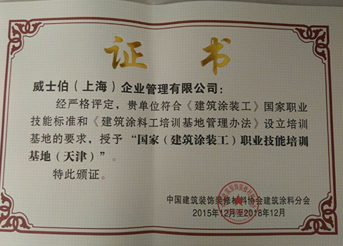 威士伯荣获“国家(建筑涂装工)职业技能培训基地”证书